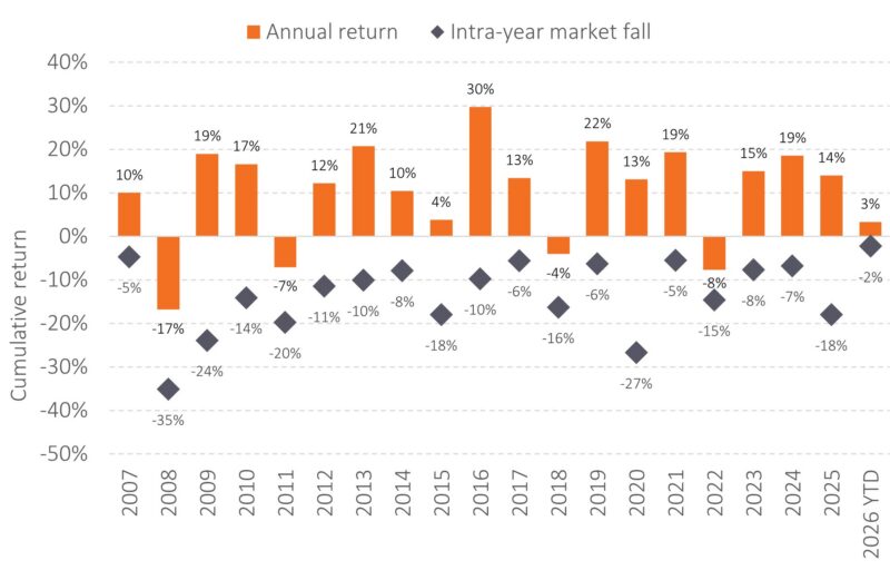 Events such as these can tempt investors to question whether they should do something. The short answer is that they shouldn’t. Periods of market stress – whether caused by conflicts, pandemics, political upheaval or economic surprises – are a feature of investing, not a bug. They feel uncomfortable, but they’re expected.
